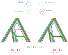 Host switch, i.e. inheritance of a symbiont from a kin lineage, is a crucial event in the evolution of parasitic or symbiotic relationships between species. This horizontal transfer also models migration events in biogeography and became of interest for the reconciliation of gene and species trees when it appeared that many discrepancies could not simply be explained by duplication and loss and that horizontal gene transfer (HGT) was a major evolutionary process in micro-organisms evolution. This switching, or horizontal transfer, pattern can also model admixture or introgression.[36] It is considered in character methods, without information from the symbiont phylogeny.[18][37] On top of the DL model, horizontal transfer enables new and very different reconciliation scenarios.