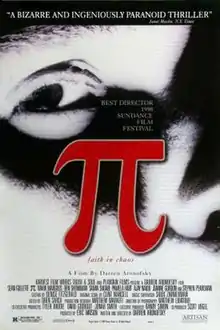 Pi (stylized as π)[lower-alpha 1] is a 1998 American conceptual psychological thriller film written and directed by Darren Aronofsky (in his feature directorial debut). Pi was filmed on high-contrast black-and-white reversal film. The title refers to the mathematical constant pi.[5][6] The story focuses on a mathematician with an obsession to find underlying complete order in the real world and contrasting two seemingly irreconcilable entities: the imperfect irrationality of humanity and the rigor and regularity of mathematics, specifically number theory.[7] The film explores themes of religion, mysticism, and the relationship of the universe to mathematics.