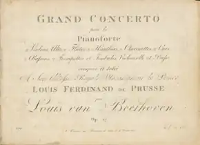 Beethoven's Piano Concerto No. 3 in C minor, Op. 37 is generally thought to have been composed in 1800, although the year of its composition has been questioned by some contemporary musicologists. It was first performed on 5 April 1803, with the composer as soloist.[1] During that same performance, the Second Symphony and the oratorio Christ on the Mount of Olives were also premiered.[2] The composition was published in 1804, and was dedicated to Prince Louis Ferdinand of Prussia. The first primary theme is reminiscent of that of Mozart's 24th Piano Concerto.