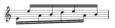 The last section introduces the simplest pattern, now in 4/8 meter, built from final four notes of the melody from the previous section,[4] and having only four distinct pitch classes. The other pianist re-enters, the phasing process restarts, and ends when both pianists return to unison. The phase cycle is repeated ad libitum from eight to sixty times according to the score.