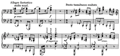 | 3 | ![]() Mm. 227–230. Passage derived from the presto tumultuoso esaltato theme. ![]() Mm. 247–248 and 251–252. Parodies of the trills theme and the languido theme. |