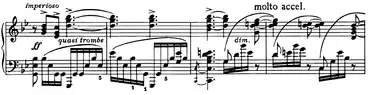 | Transition | ![]() Mm. 96–99. Imperioso and sotto voce misterioso affanato motifs. The first features an angular melody over an arpeggiated dominant chord. The second is built on block french sixth chords ![]() Mm. 114–117. Quasi tromba motif, built on an Eb major seventh chord in first inversion. It is followed by a C-dominant ninth chord, that prepares the second theme. |