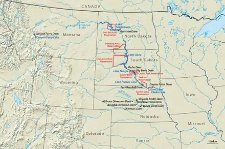 The construction of main-stream dams also affected other Native American tribes living along the Missouri River on the Fort Berthold, Cheyenne River, Standing Rock, Crow Creek, and Lower Brule Indian reservations. The Garrison, Oahe, and Fort Randall dams created a reservoir that eliminated 90 percent of timber and 75 percent of wildlife on the reservations.[9]