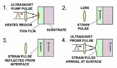 After acoustic reflection from the film-substrate interface, the strain pulse returns to the film surface, where it can be detected by a delayed optical probe pulse through optical reflectance or (for films that are thin enough) transmittance changes. This time-resolved method for generation and photoelastic detection of coherent picosecond acoustic phonon pulses was proposed by Christian Thomsen and coworkers in a collaboration between Brown University and Bell Laboratories in 1984.[1]