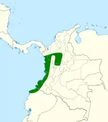 The Lita woodpecker is found in Colombia in the middle Magdalena River Valley and the Pacific slope of the western Andes, and south into northwestern Ecuador to Pichincha Province. It inhabits the interior and edges of humid and wet primary forest and also secondary forest. In elevation it ranges from about sea level to 800 m (2,600 ft).[5]