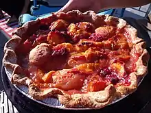 Peach pie is made with fresh, frozen or canned peaches. The basic fruit pie filling, made with fresh fruit, lemon juice, sugar and cornstarch, can be frozen in advanced and used later. The basic fresh peach pie can be combined with other fruits like strawberry, blueberry, blackberry, apple, pear or prunes.[44] Peach pie can be topped with whipped cream or streusel with other ingredients like nuts, fresh fruit, coconut or cinnamon.[29]