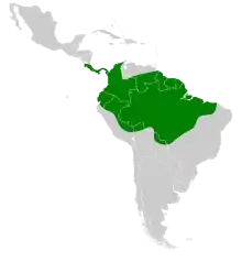 The nominate subspecies of pied puffbird is found in southern Venezuela, the Guianas, and northern Amazonian Brazil as far east as the state of Maranhão. N. t. picatus is found from southeastern Colombia south through eastern Ecuador and Peru into eastern Bolivia and east into west-central Brazil. N. t. subtectus is found from extreme southeastern Nicaragua through Costa Rica and Panama into north central Colombia, and through western Colombia into northwestern Ecuador. The species is generally resident throughout its range, but appears to make some irregular seasonal movements.[3]