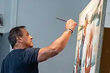 Jean Louis Avril in Univers des arts, said "Over the course of numerous events and exhibitions both in France and around the world, the theme of his works takes the form of his favorite creed: Women, women, women."[6] Farel's paintings depict sensual characters with refined forms that are set in fashionable bars grooving to the sound of dance and music, while Corsica stays his main source of inspiration.[4] In 2018, he celebrated 30 years of painting at the Château de la Buzine in Marseille, Galerie de Médicis in Paris, Casino de soiree in Ajaccio and Manoir de la Roseraie in Grignan, where he was invited to exhibit in residence.[7]