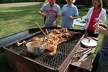 The pig pickin' is a significant part of the culture of the South; the necessary work and time needed to cook the hog makes it ideal for church gatherings ("dinner on the grounds") or family reunions, and they can be held virtually year-round thanks to the region's mild winters. Pig pickin's are popular among the most devoted tailgaters at college football games across the South. East Carolina University in Greenville North Carolina, famous for its football tailgating, has been holding an annual pig pickin' contest called the Pigskin Pig-Out since 1985.[8] The pig pickin' has been long associated with politics; many local political parties and politicians still use the pig pickin' to attract people to meetings and campaign rallies. In 1983, Rufus Edmisten, running for Governor of North Carolina at the time, was overheard saying "I've eaten enough barbecue. I am not going to eat any more. I'm taking my stand and that is it."[9]