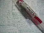 - ↑ These pens have a mechanism for which their gel ink become transparent by erasing-friction heat; "When you rub the ink with the hard rubber eraser, heat from the resulting friction causes a temperature-sensing compound to activate an acid compounds, thus neutralizing the dye."
