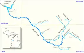The Pine River, formerly known as the South Branch Manistee River, is a 53.6-mile-long (86.3 km)[2] tributary of the Manistee River in the U.S. state of Michigan. It forms at the confluence of the North Branch and East Branch of the Pine River in northwest Osceola County, flows southwest, then west and north through the northeast corner of Lake County and into southwest Wexford County, emptying into the Tippy Dam Pond on the Manistee River in Manistee County. The Pine River watershed drains an area of 265 square miles (690 km2).[3]