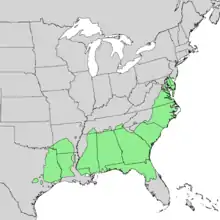 Pinus taeda, commonly known as loblolly pine, is one of several pines native to the Southeastern United States, from East Texas to Florida, and north to southern New Jersey.[2] The wood industry classifies the species as a southern yellow pine.[3] U.S. Forest Service surveys found that loblolly pine is the second-most common species of tree in the United States, after red maple.[4] For its timber, the pine species is regarded as the most commercially important tree in the Southeastern U.S.[5][6][7] The common name loblolly is given because the pine species is found mostly in lowlands and swampy areas.[8]