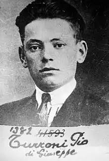 In 1920 Turroni took part in an Errico Malatesta rally in Cesena.[3] During the post war years Europe underwent intensified political polarization, and by 1923 Pio Turroni, now aged 16, was already listed in police files as a "subversive" or "anarchist".[2] In 1923, in the course of violent clashes with fascist gangs that accompanied a general strike, two of his brothers were seriously wounded by gunfire: one lost a leg.[3] Pio himself was repeatedly beaten up. In October 1923, holding valid passports, the three brothers Luigi Egisto, Urbano and Pio Turroni emigrated to Belgium, where they probably settled in or near Liège.[3][4] Details are sparse, but it is thought he remained in Belgium for approximately two years, working in the construction sector and continuing to pursue his political agenda of social activism.[5]