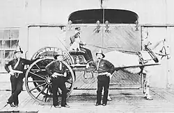The Sacramento Fire's Confidence Engine Company Number 1 started March 6, 1851 with 65 firemen, with the nickname "The Roosters". The city was a first volunteer fire department till 1872. The fire company was moved into new Sacramento Paid Fire Department in 1872.[3][4] In early Sacramento fire was a constant danger and the city has many fires. Many of the city's home and building were made of wood and even canvas. Open flame of candles and oil lamps were used for lighting. Cooking and heating were done with open flame wood. Horse-drawn fire hand water pump, were later replaced with steampower pumps. Sacramento Fire Department started using motorized fire trucks in 1912. The Pioneer Mutual Volunteer Firehouse was restore in 1959 and used as restaurant as an effort to preserve the original building. The site is now a new restaurant building near Old Sacramento State Historic Park and Interstate 5 freeway.[5][6]