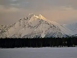 Pioneer Peak (Ahtna: Tnel'aay; Dena'ina: Dnal'iy) is a 6,398-foot (1,950 m) mountain in the Chugach Mountains in the U.S. state of Alaska. Located beside the Knik River just nine miles (14.5 km) south of Palmer and about six miles outside the Municipality of Anchorage limits, it is a prominent landmark in the Matanuska-Susitna Valley, as well as a popular hiking destination. Its Ahtna name means "the object is standing still" and its Dena'ina name means "the one that watches us".[3] The name was given in 1939 in honor of the pioneers of the Matanuska agricultural colony of the mid-1930s.[2] The Pioneer Ridge Trail leads up the eastern shoulder, beginning below 200', it allows access to the South summit. The North summit, and true summit of Pioneer Peak does not have a trail, and advanced mountaineering techniques are required. The first ascent of this peak was made June 1936 by Vernon Haik and John Wolffe via the Northwest Face.[4]