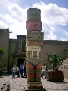 - Ride entrance: two giant Teotihuacan warrior atlantes. Above the gate we see Quetzalcoatl (Mixtec, Toltec, Aztec). At the side of the entrance two typical Mayan heads are displayed.