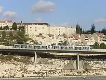 Pisgat Ze'ev is located on the Jerusalem Light Rail line. Pisgat Ze'ev Center is two stations away from the northern terminus.[22]