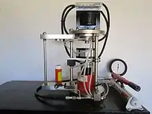 The principle of the instrument is to generate pressure by compressing a sample assembly, which includes a resistance furnace, inside a pressure vessel. Controlled high temperature is generated by applying a regulated voltage to the furnace and monitoring the temperature with a thermocouple. The pressure vessel is a cylinder that is closed at one end by a rigid plate with a small hole for the thermocouple to pass through. A piston is advanced into the cylinder at the other hand.[1]