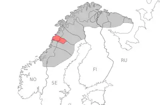 ![]() Pite Sami language area (red) within Sápmi (grey) | |
