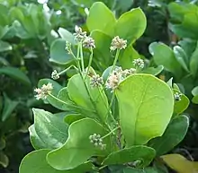 Pithecellobium keyense is a shrub or small tree. It has pinnately compound leaves, with 2-4 leaflets. The leaves are evergreen and leathery in texture. Flowers are produced in heads, and range in color from white to pink. Its fruits are a long coiled bean.[4]