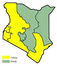 ![]() Presidential election results map. Green denotes provinces won by Kibaki, and Yellow denotes those won by Odinga. | |||||||||||||||||||||