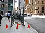 Principal photography on the film commenced in Toronto on June 2, 2014, using downtown streets decorated to resemble New York City.[32] Given sequences such as the Pac-Man chase happened at night, often the filmmakers would close the streets off from traffic at 7 PM and redecorate them to resemble New York until it was dark enough, filming from 9:30 PM up to 5:30 AM.[33] On July 29, filming was taking place outside of Markham, Ontario.[34] Filming was also done in the Rouge Park area, and extras were dressing in costume at Markham's Rouge Valley Mennonite Church.[34] On August 4, actors Josh Gad, Peter Dinklage, and Ashley Benson were spotted in Toronto filming scenes for the film on Bay Street, which was transformed into a city block in Washington, D.C., and littered with wrecked vehicles and giant holes in the pavement.[35] The Ontario Government Buildings was doubled to transform into a federal office building in Washington. Actors were aiming at aliens, which could not be seen, but were added later with computer-generated imagery.[35] On August 26, 2014, filming took place in Cobourg.[36] Filming was completed in three months, with 12 hours of shooting a day.[37]