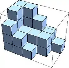 A plane partition may be represented visually by the placement of a stack of unit cubes above the point (i, j) in the plane, giving a three-dimensional solid as shown in the picture. The image has matrix form