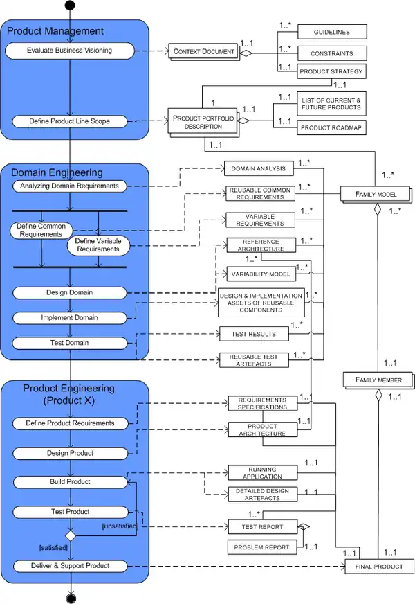 It can be argued whether phase 1, product management, is part of the product-family-engineering process, because it could be seen as an individual business process that is more focused on the management aspects instead of the product aspect. However phase 2 needs some important input from this phase, as a large piece of the scope is defined in this phase. So from this point of view it is important to include the product-management phase (phase 1) into the entire process as a base for the domain-engineering process.