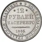 Minting began with 3-ruble coins, and 6-ruble and 12-ruble coins were added in 1829 and 1830, respectively.[2] 1,371,691 3-ruble coins were minted, along with 14,847 6-ruble and 3,474 12-ruble coins.[1] The first coin was sent to the prominent German scientist Alexander von Humboldt, who was previously asked to evaluate the use of platinum as a currency and confirm its price relative to silver. After his death, the emperor Alexander II bought that coin, and in 1859 it was returned to Russia and later became an exhibit of the Hermitage Museum in Saint Petersburg.[3]
