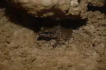 Platymantis insulatus inhabits limestone karst forest and caves in forested lowlands less than 600 m (2,000 ft) above sea level. These frogs are frequently recorded from the most moist and coolest parts of caves,[1] but it appears that both adults and juveniles venture out into the forest for feeding.[5] Development is direct[1][5] (i.e., there is no free-living larval stage[6]), with individual fecundity up to 48 eggs.[5]