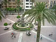 The area the Plaza Alta occupies has existed since the city was remodeled in accordance with plans the Marquis of Verboom produced. There it is designated "Plaza Alta" (high square), in contrast to the market square "Plaza Baja" (low square).[3] Since 1783, it has had a public fountain, Los Arcos, supplied with water from the city's aqueduct. The first systematic replanning of the area was undertaken in 1807 by General Castaños, Governor of the Campo de Gibraltar.[4] In the original plans, the western end of the square was raised to provide a level area and the boundaries with the surrounding streets were marked off with chains attached to stone posts. There were eight entrances: four in the corners and another four on the sides. The square was surrounded by poplars and there were orange trees in tubs. There was to have been an obelisk in the center of the square but it was replaced by a column designed by Joaquin Dolz. A bust of Manuel Godoy was planned for the top but in fact it was never added.[5] The square was redesigned in 1925 by Mayor Joaquin Bianchi when the obelisk was blown up and the area was paved over.[6] A little later, a street lamp was placed at the centre on a red brick structure which the people called la cocina económica (the cheap kitchen) while the pillars, chains and benches were kept until the surrounding streets were widened for traffic in 1929. A year later in 1930, the square was once again remodeled by Mayor Emilio Morillas Salinas, taking on the appearance it has today. The plaza was considered to be a landmark the childhood of Paco de Lucía.[7]