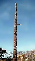 After the plaza was named, Canadian Ambassador Richard Plant Bower worked to arrange the delivery of a totem pole from Canada to Buenos Aires.[6] In 1963, Kwakiutl carvers Henry Hunt and his son Tony Hunt Sr. were commissioned by Ambassador Bower to carve a 20-metre (66 ft) totem pole for the plaza.[7] Carved from a 2,000-year old British Columbia red cedar, the totem pole depicted an eagle, a killer whale, a sea lion, a beaver, and a cannibal bird called a hok hok. After being shipped to Buenos Aires, the pole was erected in Plaza Canadá in May 1964.[8]