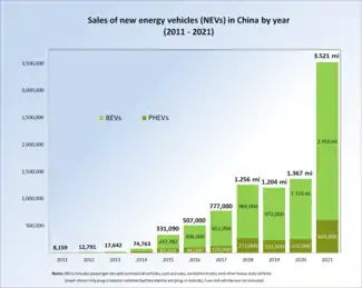 New energy vehicles sales in totaled 3.521 million in 2021, consisting of 3.334 million passenger cars and 186,000 commercial vehicles.[11] As of December 2021, the stock of highway legal plug-in cars totaled 7.84 million units, corresponding to about 46% of the global plug-in car fleet in use. Of these, all-electric cars accounted for 81.6% of the all new energy passenger cars in circulation.[143] Plug-in passenger cars represent 2.6% of all cars on Chinese roads at the end of 2021.[143]