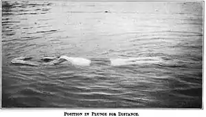 According to the 1920 Official Swimming Guide of the American Swimming Association, the plunge for distance "is a dive from a stationary take-off which is free from spring from a height of 18 inches above the water. Upon reaching the water the plunger glides face downward for a period of 60 seconds without imparting any propulsion to the body from the arms and legs." To determine the total distance traveled, the measurement was taken from the farthest part of the body from the start, "opposite a point at right angles to the base line."[2] Generally, being fat was an advantage in the sport.[3] The 60-second limitation appears to have been instituted at the English Plunging Championship around 1893.[4]