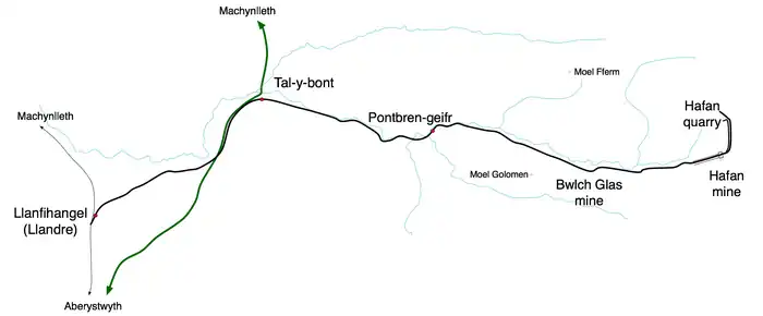 The Plynlimon and Hafan Tramway was a 2 ft 3 in (686 mm) gauge narrow gauge railway in Cardiganshire (now Ceredigion) in Mid Wales. It ran from Llanfihangel station (later renamed Llandre station) on the Cambrian Line, through the village of Tal-y-bont and the valley of the Afon Leri, into the foothills of Plynlimon Fawr. It was built to serve the lead mines at Bwlch Glas and stone quarries around Hafan[1] and opened in 1897, closing just two years later.[2] The line was a little over 7 miles (11 km) long and, despite running a short-lived passenger service, it served no communities of more than 100 people.