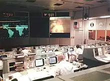 In the United States, drive-up banks often used pneumatic tubes to transport cash and documents between cars and tellers; by the 2020s some of these have been removed, obviated by the rise of mobile banking apps and the increasing sophistication of ATMs. Many hospitals have a computer-controlled pneumatic tube system to deliver drugs, documents, and specimens to and from laboratories and nurses' stations.[1] Many factories use them to deliver parts quickly across large campuses. Many larger stores use systems to securely transport excess cash from checkout stands to back offices, and to send change back to cashiers.[9] They are used in casinos to move money, chips, and cards quickly and securely. Japanese love hotels use them to allow customers to settle bills anonymously (no face-to-face contact).[10] NASA's original Mission Control Center had pneumatic tubes connecting controller consoles with staff support rooms. Mission Operations Control Room 2, was last used in its original configuration in 1992 and then remodeled for other missions. Because the room was designated a National Historic Landmark in 1985, it was decided in 2017 to restore it to its 1960s condition.[11] The pneumatic tubes were removed and sent to the Cosmosphere in Kansas for restoration.[12]