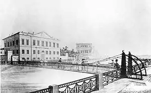 The bridge was built in 1823-1824 to designs by architects Wilhelm von Traitteur and Christianovich as a pedestrian bridge suspended by chains. There are only three such bridges left in Saint Petersburg today, the other two being Lions Bridge and Bank Bridge. With the time the construction became unstable, and it was reengineered in 1936 by setting the additional support underneath it, so the chains became merely a decoration. In 1981-1983 the bridge was reconstructed yet again, and restored as a suspended bridge.