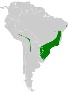 It is found in Argentina, Bolivia, Brazil, Paraguay, Peru, and Uruguay. In Uruguay, it was found for the first time in 1997 in the gallery forests of the Yaguarón River, in Cerro Largo Department.[2]