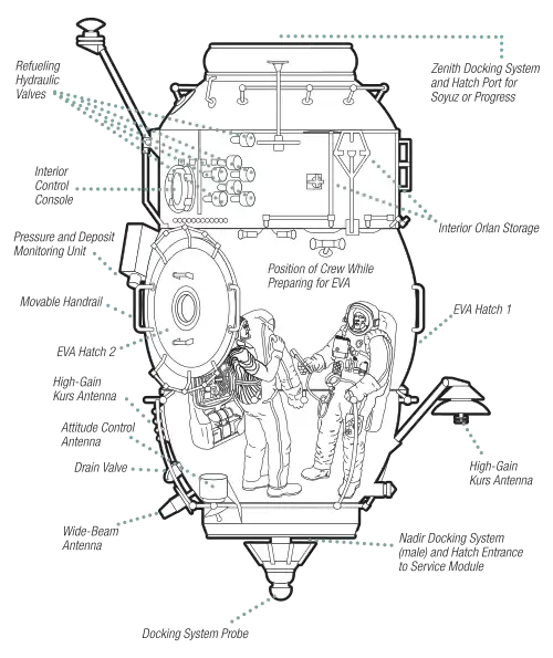 Poisk docked to the zenith port of the Zvezda module on November 12, 2009, and serves as a docking port for Soyuz and Progress spacecraft and as an airlock for spacewalks. Poisk will also provide extra space for scientific experiments, and provide power-supply outlets and data-transmission interfaces for two external scientific payloads to be developed by the Russian Academy of Sciences.