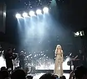 The Polish performance featured Kasia Moś performing in a white dress designed by designer Mario Menezi, joined by a violinist dressed in black.[17] The stage was predominately in blue colours with the LED floor and screens displaying a cloudy sky that transitioned into a constellation of stars that form the word "Freedom" in various languages, as well as images of birds, dolphins and horses.[18][19][20] In regards to the staging, the director for the Polish performance, Konrad Smuga, stated: "Kasia fights for animal rights and this is the main message of this song. I hope it is very legible and clear. Her vocal power does not require any great setting, she herself fills the stage with her expression, so we tried not to spoil it, but also to convey the thought that we agreed at the first meeting that this is what we wanted in this song."[17] The violinist that joined Moś on stage was her brother Mateusz Moś.[21]