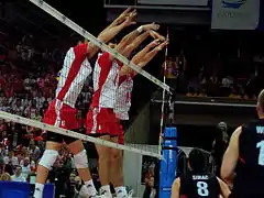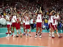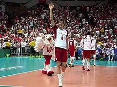On 30 August 2014, Poland played their historic match at the National Stadium in Warsaw against Serbia as opening meeting of the 2014 World Championship.[38] It was the opening match of the World Championship 2014 in Poland.[39] Polish team won 3–0 and with attendance over 62,000 audience.[40] In their first group, Pool A, Poland won all 5 matches and lost just one set with Cameroon. In their second group, Pool F, the host team won 3 of their 4 matches. On 10 September 2014, they lost to the United States (1–3), but then beat the national teams of Italy (3–1), Iran (3–2) and France (3–2).[41] Poland took second place in Group F. The breakdown in the next stage of the tournament was decided by drawing lots. Poland went into group H with Brazil and Russia. Some commentators and fans called Pool H the "Group of Death", but it was a happy result for the home team. The Polish national team won two dramatic matches after tie-breaks at Atlas Arena in Łódź. On 16 September 2014 they beat Brazil. Poland's main scorer in the match was Mariusz Wlazły, who gained 31 points for his team.[42] Two days later, Poland needed just two winning sets for promotion to the semi-final. Poland beat Russia and took first place in the group.[43] On 21 September 2014 the Polish team won the semi-final match against Germany, which guaranteed for Poland their third ever medal at the World Championship.[44][45][46] On 21 September 2014 Poland won the title of World Champion 2014, for the first time in 40 years.[47] Poland beat Brazil (3–1).[48][49] Polish players received 3 of 8 the individual awards in the tournament: Karol Kłos as Best blocker, Mariusz Wlazły as Best opposite and Most valuable player.[50][51] After victory Poland have risen two places in FIVB ranking and has been taken 3rd place.[52]