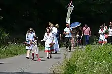 Meanwhile, the Polish People's Republic called on Polish diaspora to return and repopulate the areas previously inhabited by Germans. More than 15,000 Poles saw the end of the Second World War in Bosnia and Herzegovina. On 1 July 1945, their representatives held a conference and decided in favour of repatriation.[2] Their emigration was hastened by a terror campaign launched against them and Ukrainians by the Chetniks "with the support of a large part of the Serb population" who "did not view these minorities with sympathy". Thousands of Poles and Ukrainians were expelled from their homes by Chetnik elements in late 1945 and early 1946. A Polish militia, supported by the Yugoslav authorities, was set up to defend the minority following the Polish ambassador's visit to Prnjavor in December 1945, but Kunecki criticized it as ineffective.[4] After notifying the Yugoslav authorities and the Polish embassy in Belgrade, the Polish delegation went to Poland and opted for Bolesławiec County in Lower Silesia. They encountered problems with the Yugoslav government when the latter refused to compensate them for the houses and land they had left behind. The Yugoslav government even demanded that Poland pay for the cattle that the Bosnian Poles took to Poland. The insulted and disappointed Poles appealed directly to the Prime Minister of Yugoslavia Josip Broz Tito. Their transfer from Bosnia and Herzegovina to Poland took place between 28 March and 2 November 1946.[2] By 1953, their numbers had fallen to 1,161, and by 1981, there were 609 Poles living in Bosnia and Herzegovina.[4]