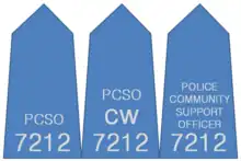 Most PCSOs tend to wear blue epaulettes on their shoulders, although some forces use black epaulettes. Since 2009 a few forces began embroidering names on to epaulettes.[43][44][45] PCSOs are issued with hi-visibility jackets and waterproof coats of varying design depending on the force. Officers may also be issued with a simple tabard for traffic duties. PCSOs wear nylon duty belts with quick release buckles to hold their equipment in pouches.