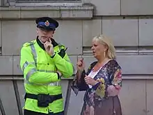 A PCSO of the Greater Manchester Police (GMP) talking to a member of the public whilst on duty. Note the plain blue band on his hat.