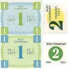 As Western currency came into the country from emigrant families and foreign workers, the government in turn attempted to gather it up by various means, most visibly by establishing a chain of state-run Pewex and Baltona stores in all Polish cities, where goods could only be bought with hard currency. It even introduced its own ersatz U.S. currency (bony PeKaO in Polish).[23] This paralleled the financial practices in East Germany running its own ration stamps at the same time.[23] The trend led to an unhealthy state of affairs where the chief determinant of economic status was access to hard currency. This situation was incompatible with any remaining ideals of socialism, which were soon completely abandoned at the community level.