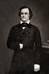 Two Kentuckians—Breckinridge's friend, Governor Lazarus W. Powell and his enemy, Linn Boyd—were potential Democratic presidential nominees in 1856.[116] Breckinridge—a delegate to the national convention and designated as a presidential elector—favored Pierce's re-election but convinced the state Democratic convention to leave the delegates free to support any candidate the party coalesced behind.[117] To a New Yorker who proposed that Breckinridge's nomination could unite the party, he replied "Humbug".[118]