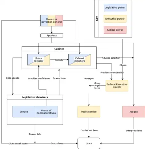 Separation of powers is the principle the power of state should be shared between multiple bodies, in order to avoid the concentration of power in one entity.[6] The legislature proposes and debates laws that the executive then administers, and the judicial arbitrates cases arising from the administration of laws and common law. However, in accordance with Westminster system, there is no strict separation between the executive and legislative branches, with ministers required to also be members of the legislature.[7] Only the High Court can deem if a law is constitutional or not.[6]
