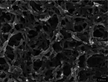 Polyaniline nanofibers are a high aspect form of polyaniline, a polymer consisting of aniline monomers, which appears as discrete long threads with an average diameter between 30 nm and 100 nm. Polyaniline is one of the oldest known conducting polymers, being known for over 150 years.[2] Polyaniline nanofibers are often studied for their potential to enhance the properties of polyaniline or have additional beneficial properties due to the addition of a nanostructure to the polymer.[2] Properties that make polyaniline useful can be seen in the nanofiber form as well, such as facile synthesis, environmental stability, and simple acid/base doping/dedoping chemistry. These and other properties have led to the formation of various applications for polyaniline nanofibers as actuators memory devices, and sensors.