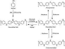Methods for the polymerization of polyaniline nanofibers seen in literature primarily include [redox|chemical oxidative] polymerization, interfacial synthesis, and "rapid mixing" methods.[3][4][5][6] Other less common methods include nanofiber seeding, electrosynthesis, electrospinning, and preforming polymerization in dilute aniline solutions.[7]