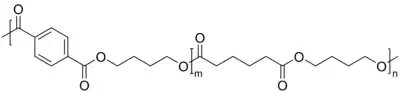 PBAT (short for polybutylene adipate terephthalate) is a biodegradable random copolymer, specifically a copolyester of adipic acid, 1,4-butanediol and terephthalic acid (from dimethyl terephthalate). PBAT is produced by many different manufacturers and may be known by the brand names ecoflex, Wango, Ecoworld, Eastar Bio, and Origo-Bi. It is also called poly(butylene adipate-co-terephthalate) and sometimes polybutyrate-adipate-terephthalate[1] (a misnomer) or even just "polybutyrate".[2] It is generally marketed as a fully biodegradable alternative to low-density polyethylene, having many similar properties including flexibility and resilience, allowing it to be used for many similar uses such as plastic bags and wraps.[3] It is depicted as a block co-polymer here due to the common synthetic method of first synthesizing two copolymer blocks and then combining them. However, it is important to note that the actual structure of the polymer is a random co-polymer of the blocks shown.